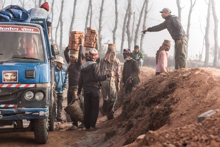 From the dawn-laced window of my hotel room on a hilltop on the outskirts of Bhaktapur, the seat of one of the ancient kingdoms of the Kathmandu Valley, the skies are hazy from the many smokestacks of brick making operations. With the sun rising behind them in the distance, I find it peculiar how something which can appear so post-apocalyptic can also somehow be so beautiful. Drawn by this particular crystalization of beauty, I left the hotel, worked my way down some terraced farming plots, and ventured forth. With a sense of treading into something secretive, something private, I sheepishly entered one of the brick making grounds. In my estimation, the operation covers about 15 acres, with drying bricks stacked throughout into makeshift walls, creating the appearance of fenced in yards.